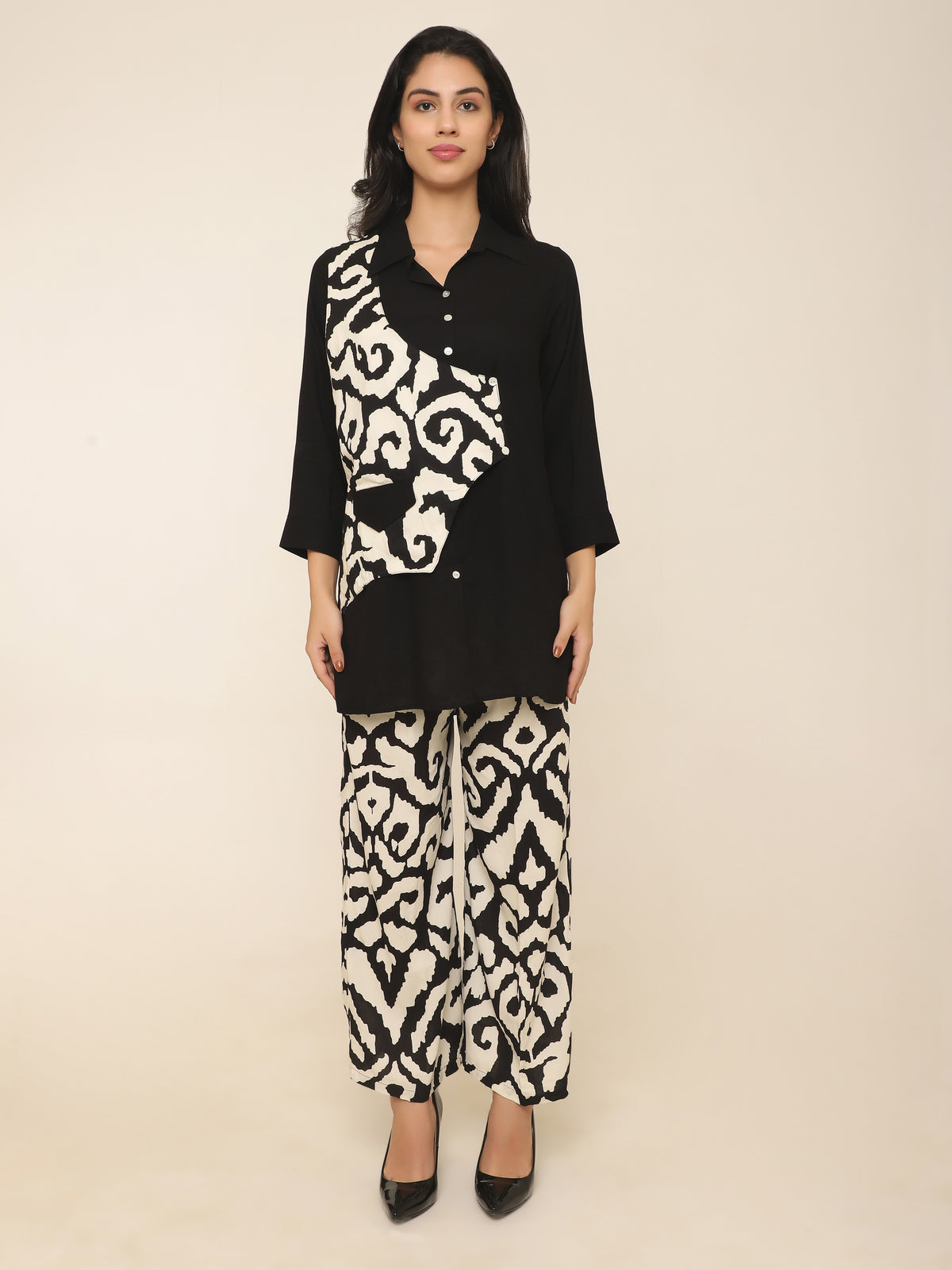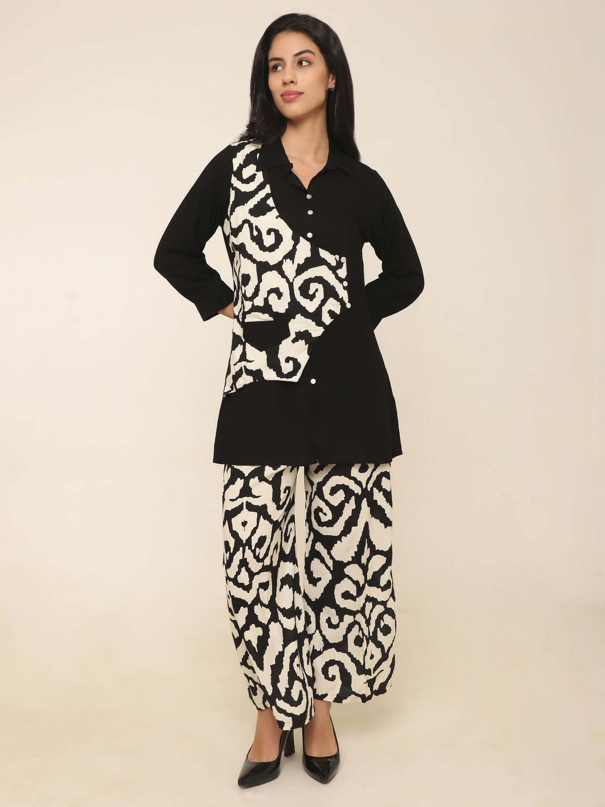 Black Co-ord Set with Printed Waistcoat Design & Palazzo Pants