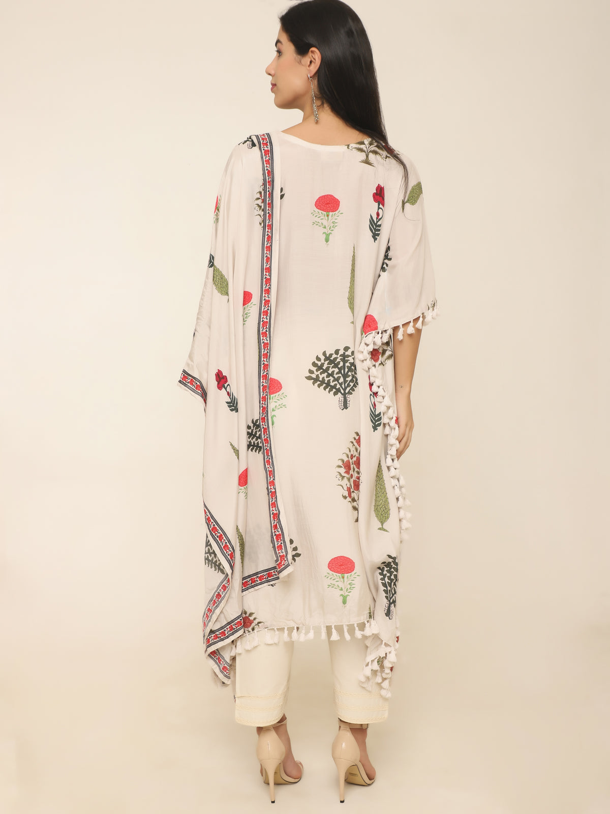 Cream Botanical Print Kaftan Set with Dupatta & Pants in Georgette