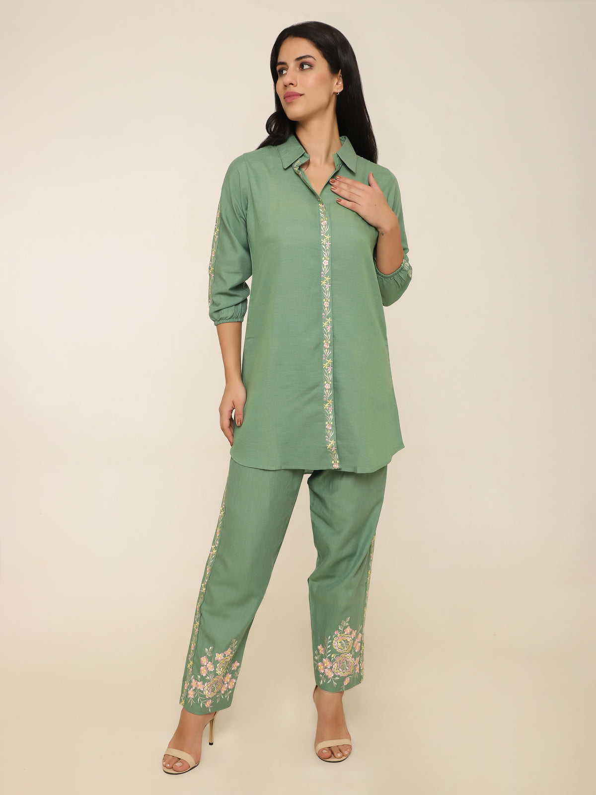 Green Co-ord Set with Embroidery on Sleeves, Collar & Pant Hems