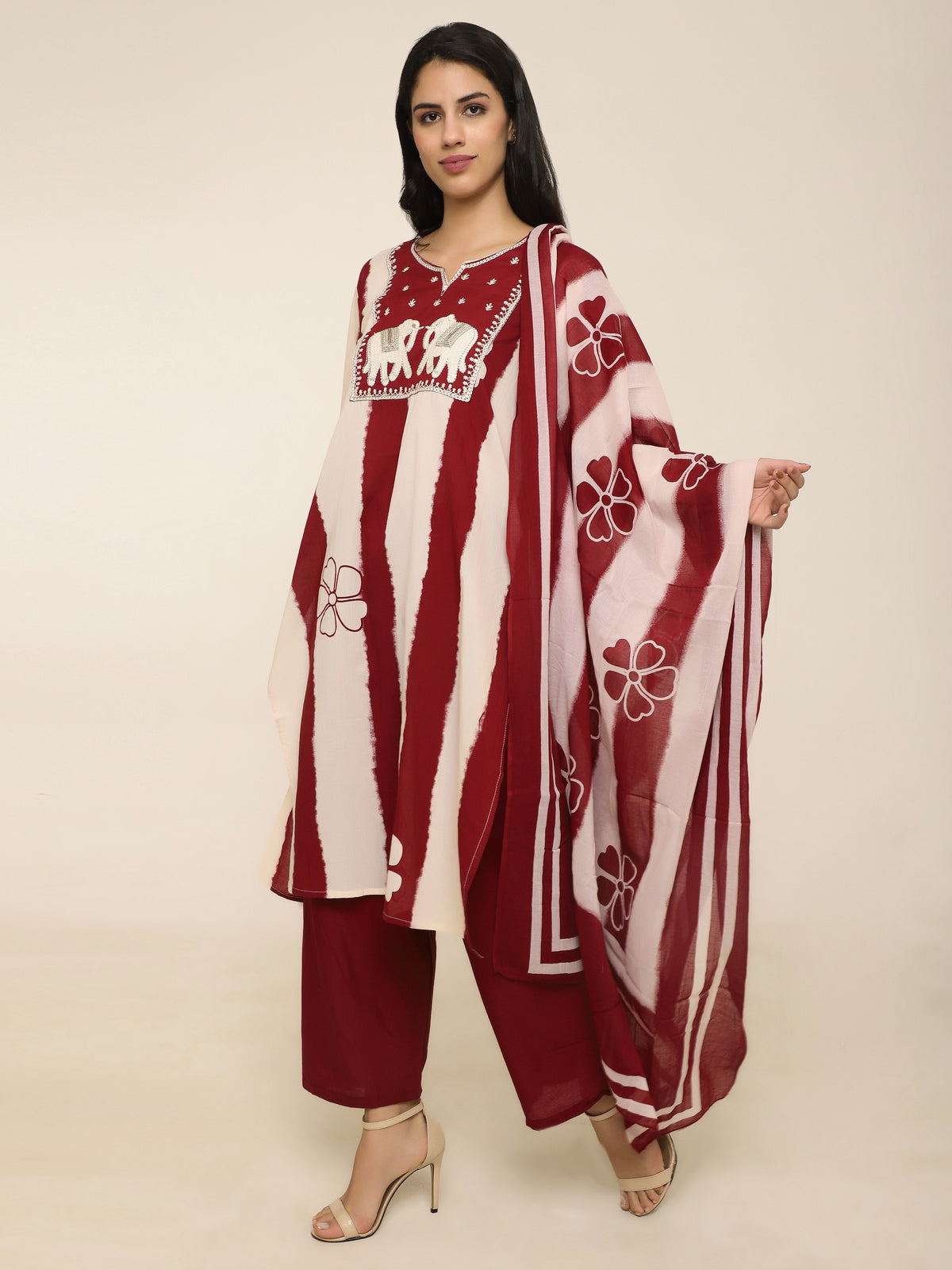 Red & White Printed 3-Piece Suit with Elephant Embroidery