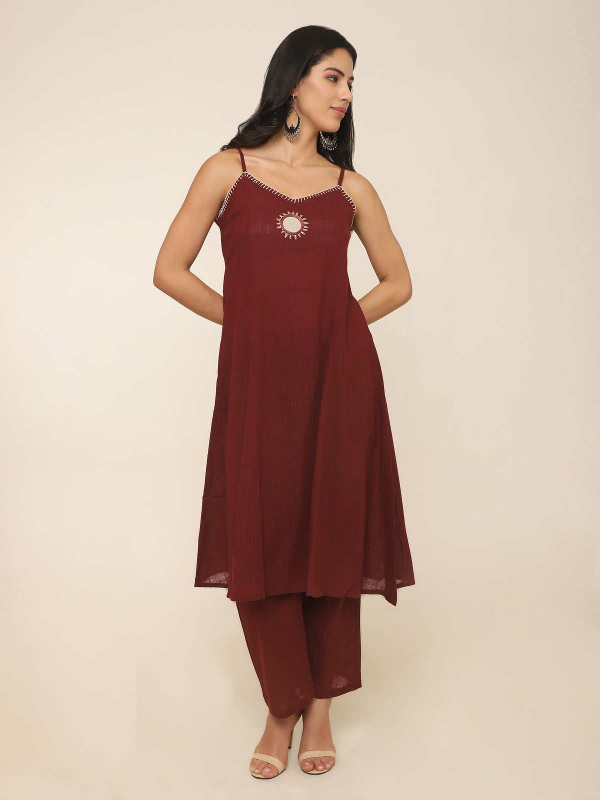 Wine Cotton A-Line Kurti Set with Mirror, Bead Embroidery & Pocket